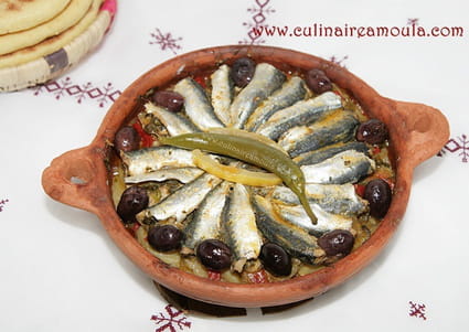 Verser la cuillère à soupe de chermoula puis déposer les poivrons grillés, les sardines, les olives violettes, le citron confit et le petit poivron fort. Couvrir le tajine et laisser cuire pendant 20 minutes. http://cuisine.journaldesfemmes.com/